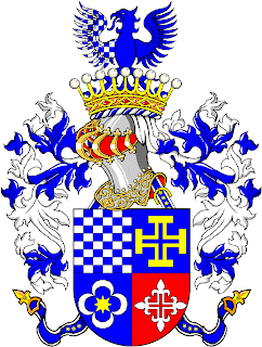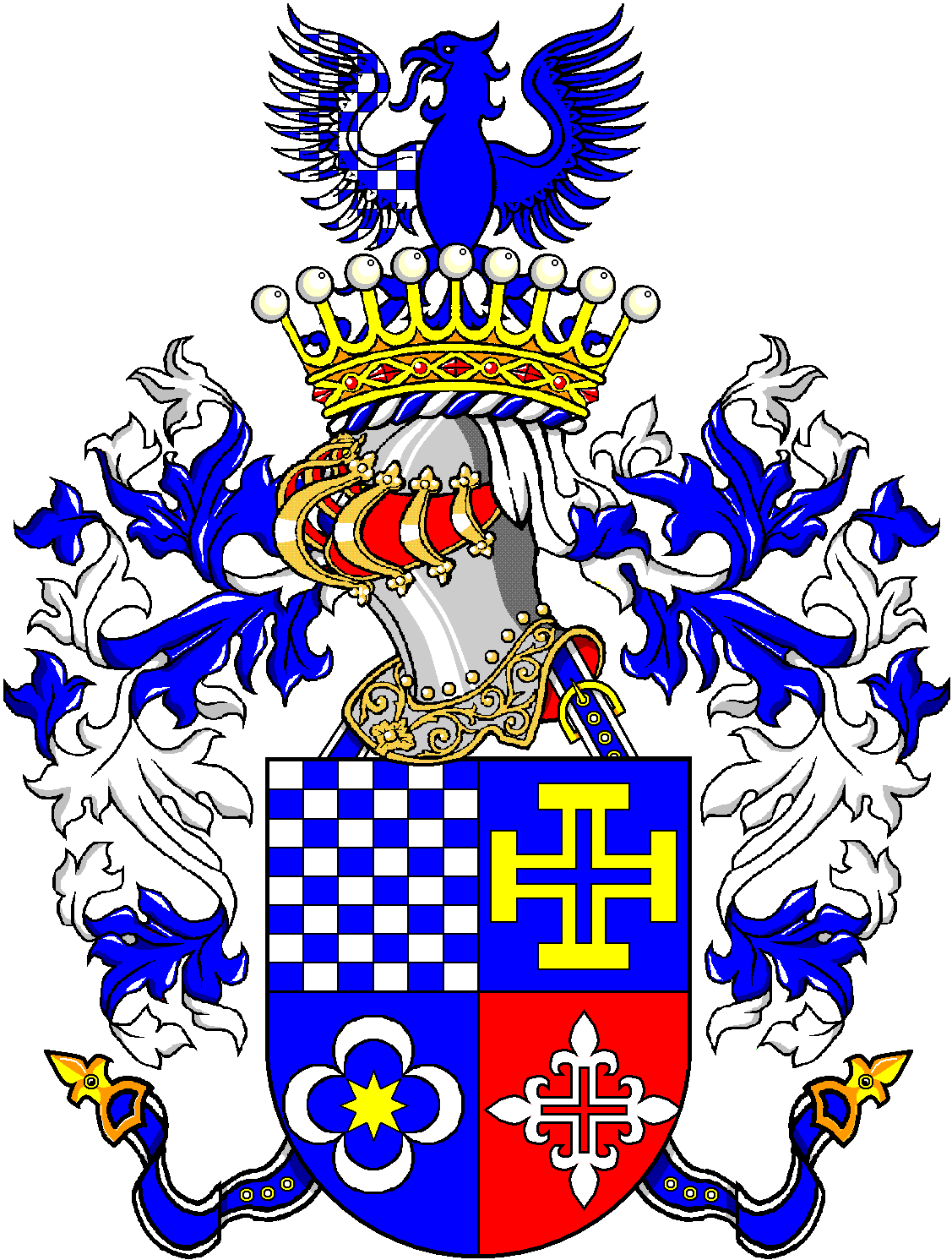 Guerreiro: de vermelho, com um leão de ouro atacante, empunhando na mão direita uma espada de prata guarnecida de ouro; diferença: bordadura de prata, com os caractéres de negro "AVE MARIA GRATIA PLENA", brica de Carvalho: de azul, com uma estrela de ouro de oito raios dentro de uma caderna de crescentes de prata; elmo a 3/4 de prata tauxeado de ouro e forrado de azul; virol e paquifes de ouro forrados de vermelho; timbre de Guerreiro: braço direito armado de prata, sustendo na mão uma espada de prata guarnecida de ouro; correias de vermelho perfiladas de ouro, tachões, fivela e ponteiras do mesmo.
